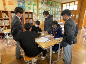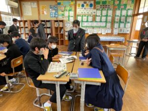 進路講話では、高校に入学して1年が経ち母校で現況報告と今後の抱負や中学生に向けたアドバイスなどを講話してくれました。中学生はポイントになる内容をメモし、真剣に聞いてました。 進路講話後は、商業科の出前授業を実施しました。出身中学校の先輩たち6名が補助に入ってくれました。 出前授業の内容は、「簿記」をテーマにスゴロク形式で行い、中学生はみんな楽しそうに取り組んでいました!