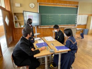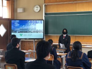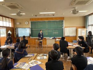 本日、天城中学校で卒業生の進路講話と商業科の出前授業を実施しました。