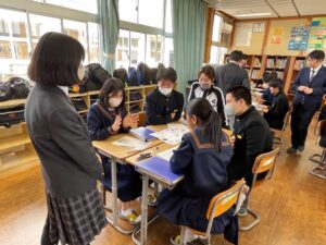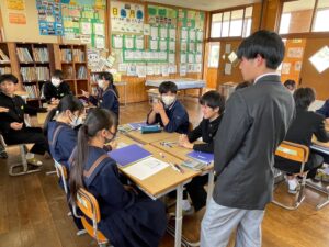 進路講話では、高校に入学して1年が経ち母校で現況報告と今後の抱負や中学生に向けたアドバイスなどを講話してくれました。中学生はポイントになる内容をメモし、真剣に聞いてました。 進路講話後は、商業科の出前授業を実施しました。出身中学校の先輩たち6名が補助に入ってくれました。 出前授業の内容は、「簿記」をテーマにスゴロク形式で行い、中学生はみんな楽しそうに取り組んでいました!